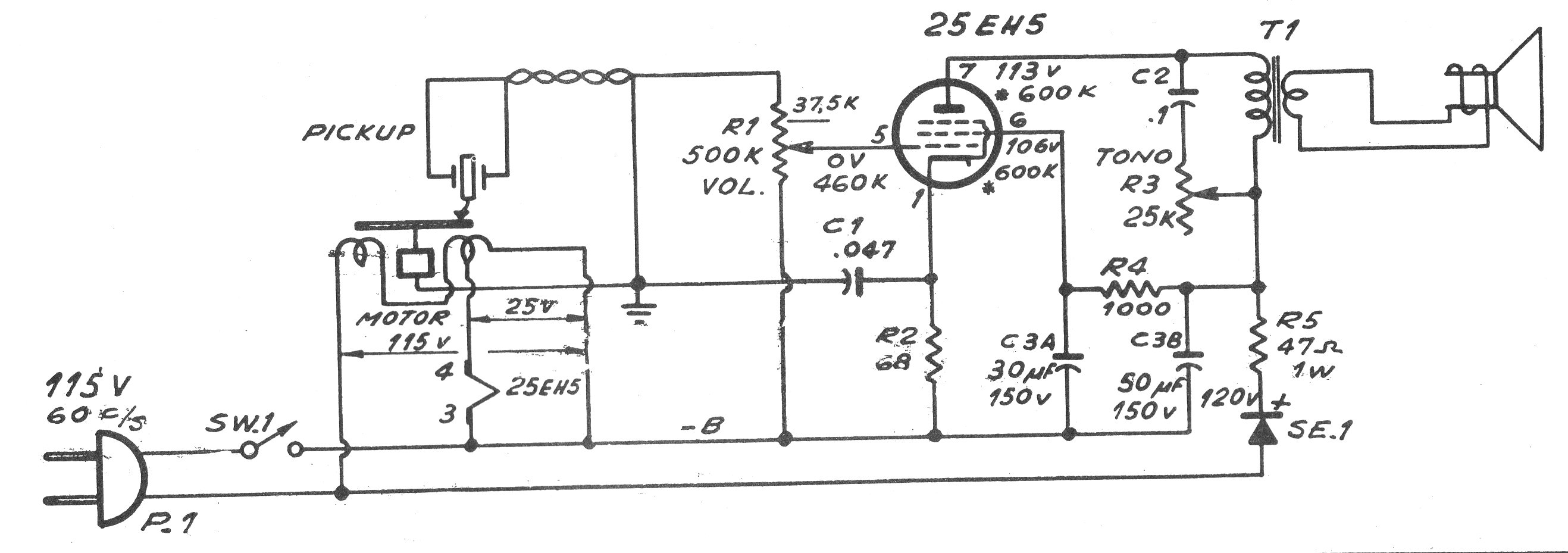 Este circuito es una época en que los diodos rectificadores de silicio como el 1N4004 y 1N4007 no existían y los rectificadores eran de selenio. Evidentemente, para el montaje si se obtiene la válvula y el transformador de salida, el diodo puede ser el tipo moderno. El circuito es para una electrolla o un reproductor de discos portátil de la época.