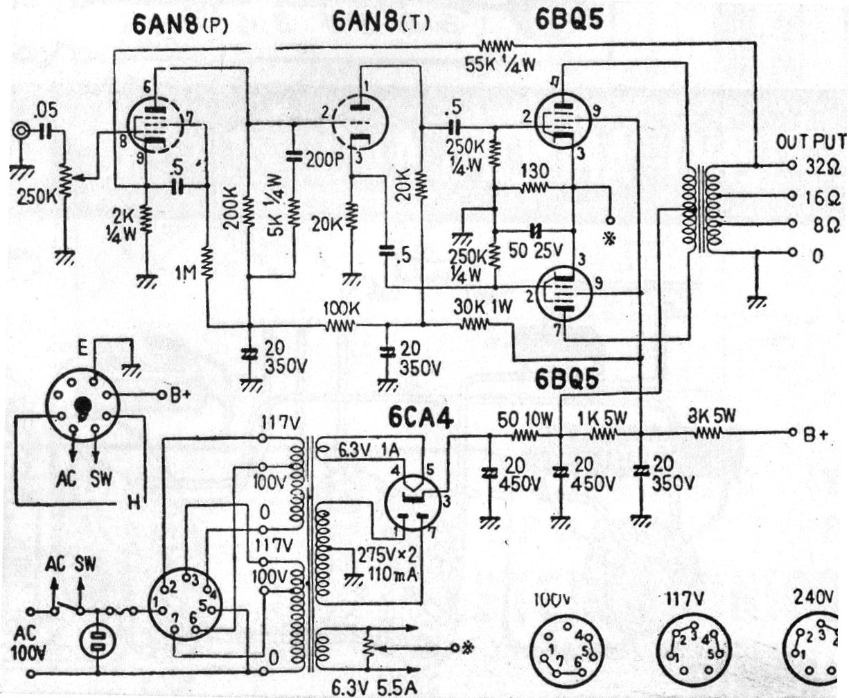 Este amplificador proporciona una potencia de salida de 10 W y utiliza sólo dos transformadores que, además de las válvulas, son los componentes críticos para un eventual montaje. La entrada tiene varias tensiones, pero se puede utilizar un transformador común con tensión única. Este tipo de configuración de entrada era muy común en la época en los equipos comerciales.