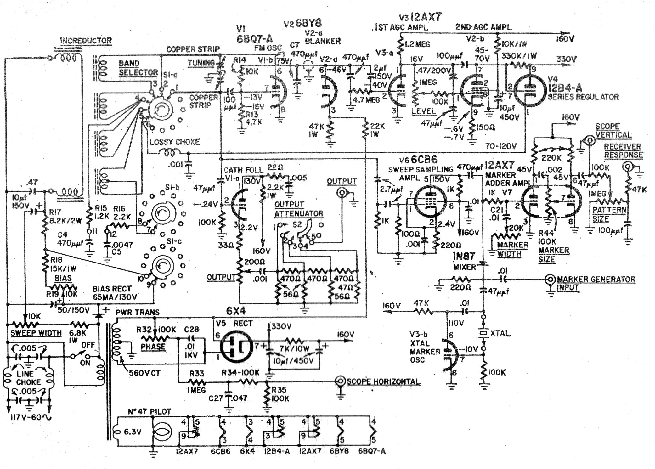 Este es el diagrama de un generador de barrido comercial utilizado en los 1970 para el ajuste de circuitos resonantes, principalmente FIs de televisores de la época. El circuito genera una señal que varía continuamente una banda de frecuencias, posibilitando así el levantamiento de su curva de respuesta y el ajuste preciso de su actuación.