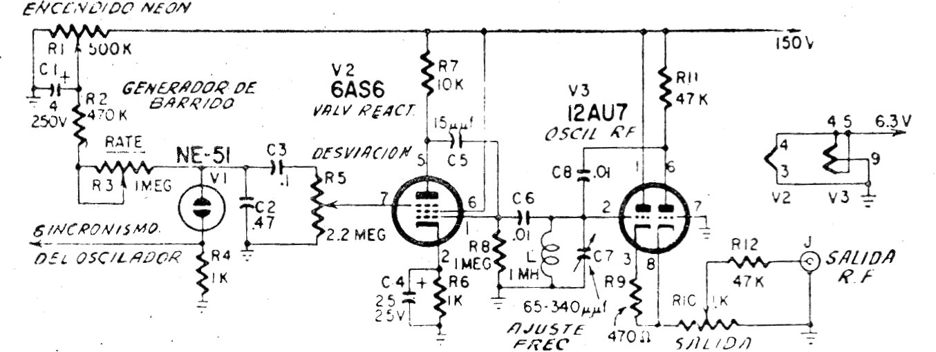 Este es el diagrama de un generador de barrido comercial utilizado en los 1970 para el ajuste de circuitos resonantes, principalmente FIs de televisores de la época. El circuito genera una señal que varía continuamente una banda de frecuencias, posibilitando así el levantamiento de su curva de respuesta y el ajuste preciso de su actuación.