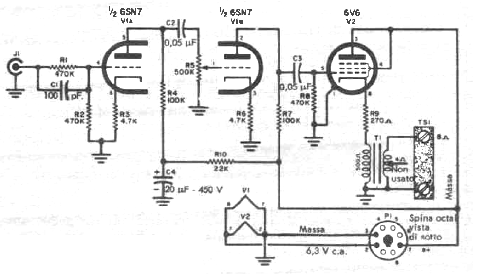 Este amplificador fue encontrado en una documentación de los años 60, debiendo ser alimentado por fuente que se da en V340. Los componentes críticos son las válvulas y el transformador de salida.