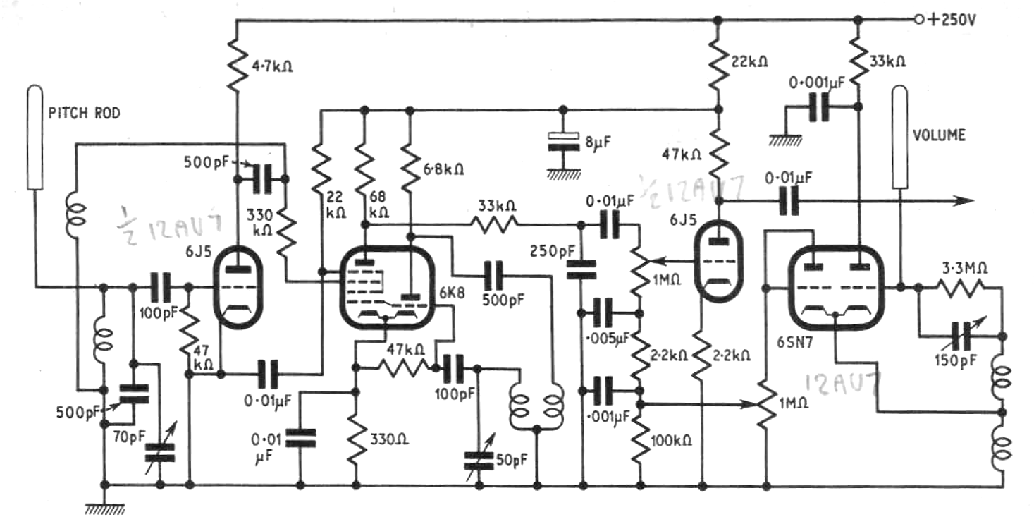Este circuito se encontró en una publicación inglesa de los años 70. Los componentes críticos son las bobinas que se deben calcular para que el circuito oscile alrededor de 100 kHz. La fuente no se incluye, y las válvulas admite equivalentes, lo que está anotado a lápiz en el propio diagrama. El circuito es bastante crítico exigindo la optimización.