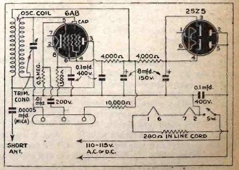 Este circuito de dos válvulas opera en el rango de onda media y tiene un alcance de algunas decenas de metros. La energía proviene de la red eléctrica y los filamentos de las válvulas están conectados en serie.