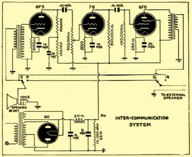 Este intercomunicador bidireccional se encontró en una publicación de 1943. Los transformadores son tipos de salida para válvulas y el altavoz funciona como micrófono. El rango depende de las pérdidas en los cables. El circuito es de dos vías, pero se puede ampliar a más vías.