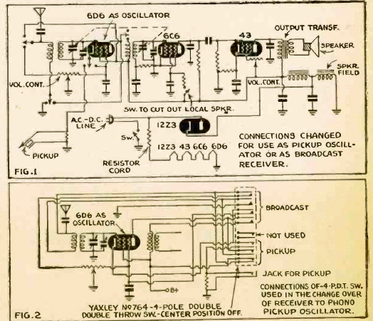 Este circuito de una documentación de 1943 muestra cómo adaptar un receptor de radio de válvula ordinario para que también funcione como un oscilador de fonógrafo. En esta función, transmite señales desde un tocadiscos a una radio AM ordinaria cercana.