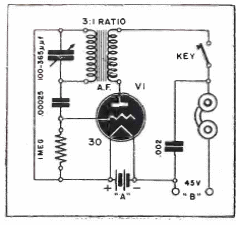 Este oscilador sintonizable produce sonidos que pueden ajustarse mediante un condensador variable. Los auriculares son de alta impedancia y la alimentación es suministrada por los voltajes indicados en el diagrama.