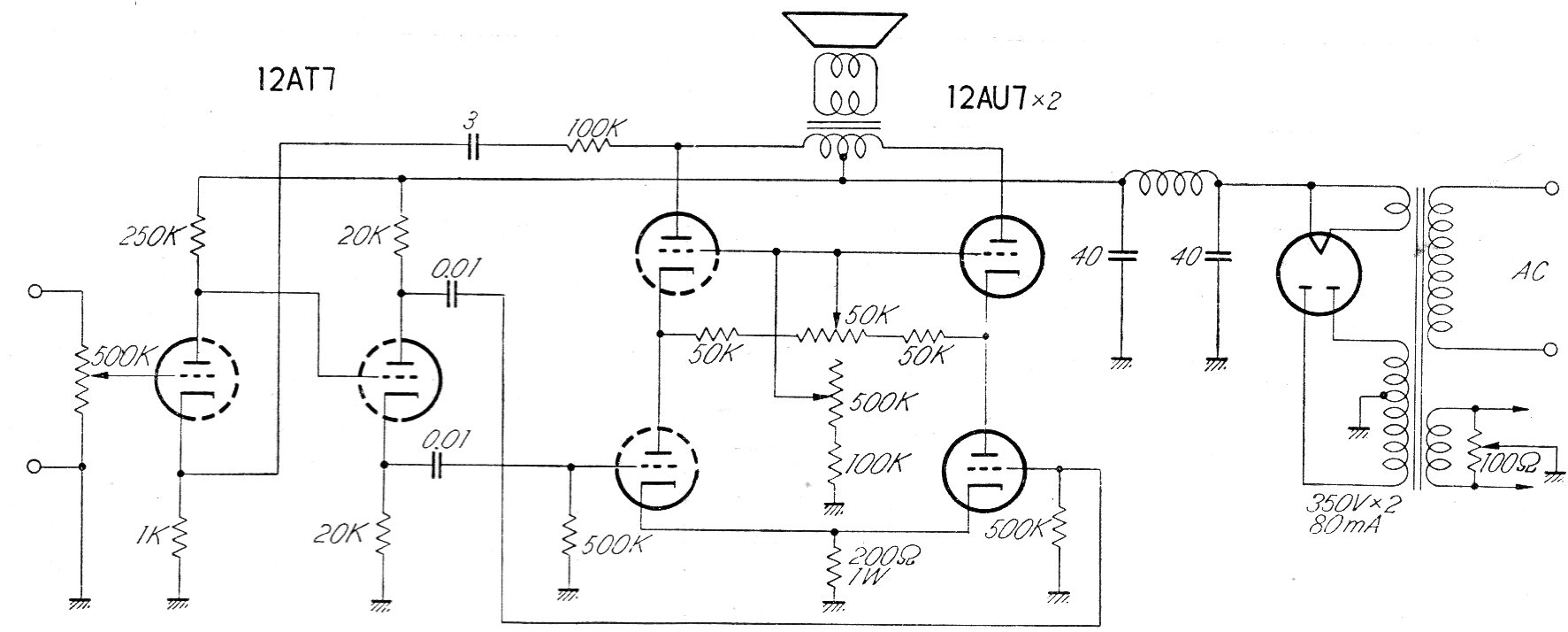 Este circuito utiliza válvulas de baja potencia en la salida en una aplicación poco común encontrada en una publicación japonesa de los años 60. El circuito incluye fuente de alimentación y la potencia es de fracción de vatios con excelente calidad de sonido.