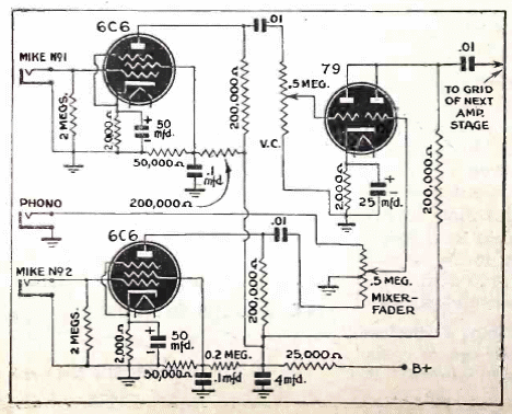El circuito de 3 válvulas que se muestra se encontró en una publicación de 1944. El circuito no incluye la fuente de alimentación y tiene dos entradas. Se puede ampliar a más entradas.