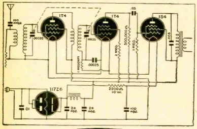 Se trata de un receptor de amplificación de RF a dos válvulas de doble condensador variable, encontrado en una publicación de 1943. El circuito tiene salida de altavoz y se alimenta de la red a través de una fuente directa con doble válvula de diodo.