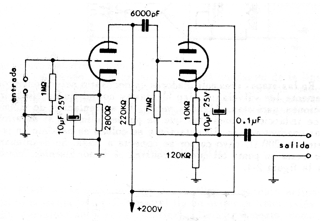 Este es un circuito típico de preamplificador de audio con un doble triodo tal como el 12AU7 o 12AX7, proporcionando una excelente ganancia para una fuente de señal de poca intensidad. La alimentación debe ser hecha con fuente de excelente filtración, normalmente la del propio amplificador con el que el circuito va a funcionar. Este circuito es de una publicación española de 1966.