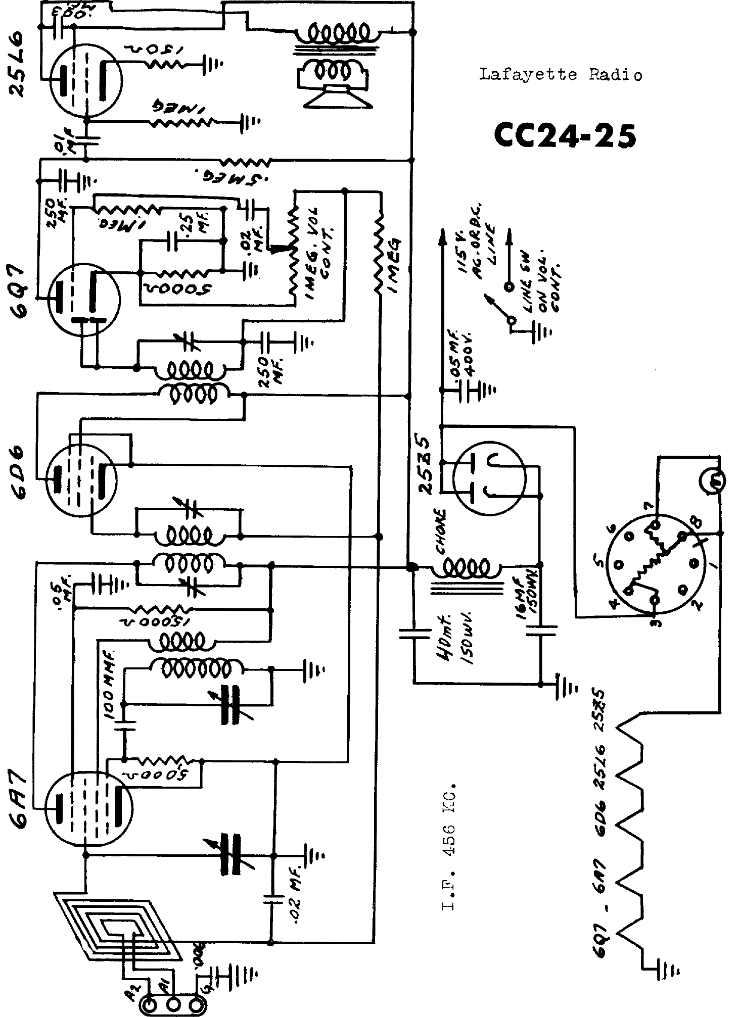 Hemos obtenido este diagrama en un manual de circuitos de 1940. El receptor de 5 válvulas utiliza una antena de cuatro y tiene la alimentación directa, con los filamentos conectados en serie, sin la necesidad de un transformador.