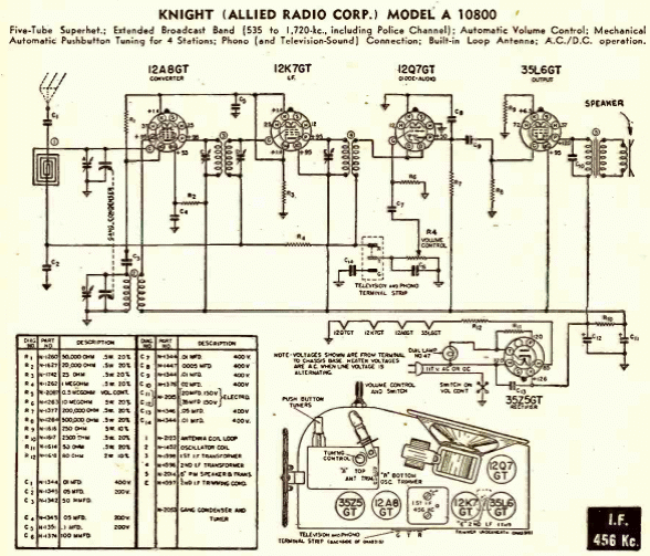 Esta radio del grupo Knight of the Allied Radio Corp es de una documentación de 1941. Tenga en cuenta la representación esquemática diferente, aunque los tubos utilizados son bien conocidos por nuestros amigos amantes de los tubos, ya que se convirtieron en algo común durante muchos años. La antena era de cuadro, pero había una opción para una antena externa. Los IF de 455 kHz y la salida de altavoz.
