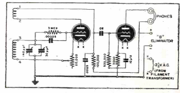 Encontrado en documentación de 1944, este receptor de dos válvulas tiene escucha de auriculares de alta impedancia. El circuito es de tipo regenerativo y el rango sintonizado depende de las bobinas. La alimentación es proporcionada por baterías.