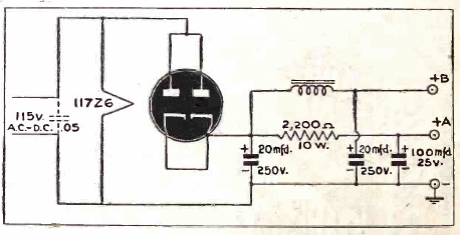 Esta fuente de alimentación de 1944 también se puede utilizar para alimentar diseños de válvulas experimentales, por supuesto, necesita un transformador adicional para los filamentos. El circuito tiene una corriente de unos cientos de miliamperes dependiendo de la válvula.