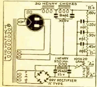 Este circuito suministra energía a los receptores de válvula que usan baterías. El circuito es de una documentación de 1942. El transformador debe tener un secundario de alta tensión entre 125 y 250 V y una corriente de al menos 20 mA.