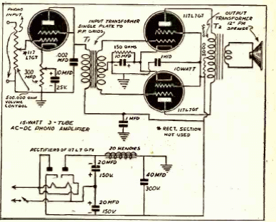 Este circuito se encontró en una publicación de 1942. Utiliza 4 válvulas, ya que el rectificador no se representa como tal. El circuito no utiliza transformador en la fuente de alimentación y tiene una salida en contrafase. La inversión de fase se realiza mediante transformador.