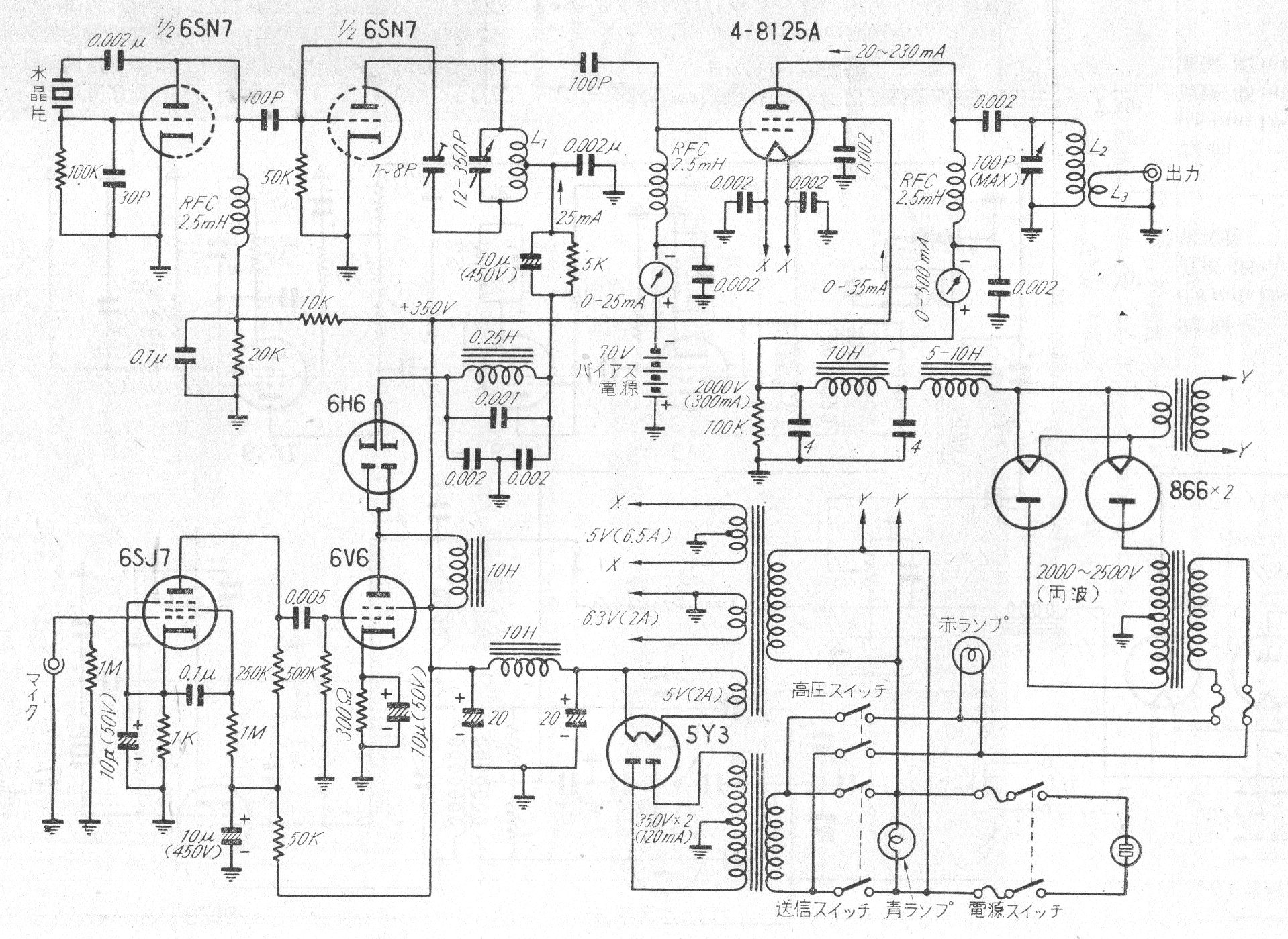 Encontramos este transmisor que puede operar en el rango de los 40 o 80 metros (3,5 o 7 MHz) de radioaficionados en una documentación japonesa de los años 50. Los detalles de la construcción de las bobinas no fueron dados. El circuito incluye la fuente de alimentación y la etapa de modulación.