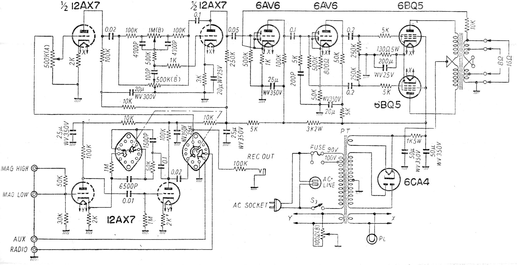 Encontramos este amplificador en una documentación japonesa de los años 60. El circuito tiene salida en push-pull con transformador especial, uno de los elementos críticos del circuito para un eventual montaje.