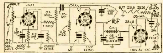 Este circuito se encontró en una publicación de 1943. Utiliza solo 3 entradas y tiene una buena sensibilidad de entrada. El circuito se alimenta directamente de la red eléctrica mediante una fuente de alimentación sin transformador.