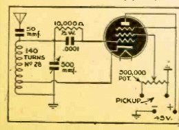 Este oscilador de fonógrafo es uno de los muchos que tenemos en nuestra sección de válvulas. Este circuito funciona con batería y usa sola una válvula pentodo. En la banda de onda media, su alcance es de algunas decenas de metros.