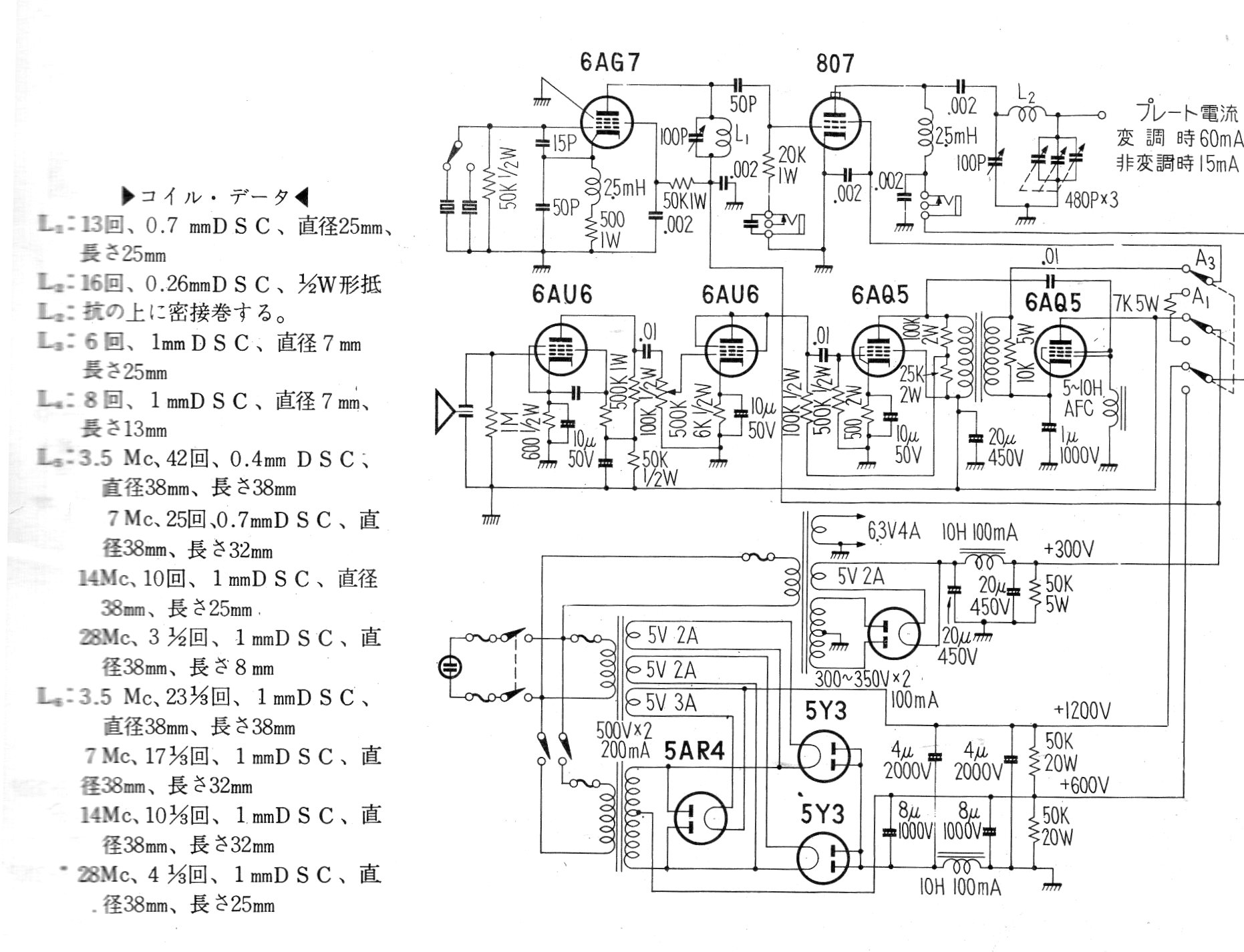 Este potente transmisor para el rango de 10 a 80 metros de radioaficionados fue encontrado en una documentación japonesa de 1967. Si bien los datos de las bobinas están en japonés es posible percibir cuál es el número de espiras, hilo y diámetro de cada bobina. El circuito incluye la fuente de alimentación.