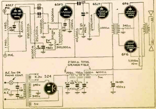 La figura muestra un diagrama de un amplificador típico de 1943 con válvulas de salida push-pull. El circuito tiene una potencia de algunas decenas de watts y es alimentado por la red eléctrica. Tenga en cuenta el filtrado con múltiples capacitores para el nivel de ruido más bajo posible.