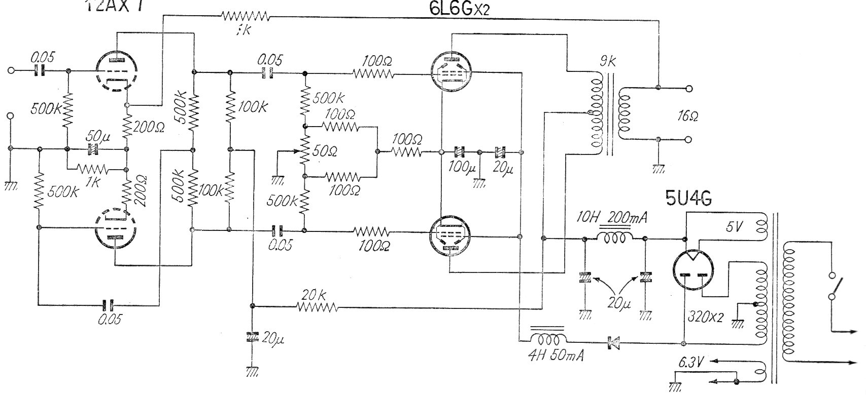 Encontramos este buen amplificador de potencia de audio en una documentación japonesa de los años 60. El circuito incluye la fuente de alimentación y las válvulas pentodo 6L6G están conectadas en contrafase con un transformador de salida apropiado. Una 12 AX7 se utiliza como excitador.