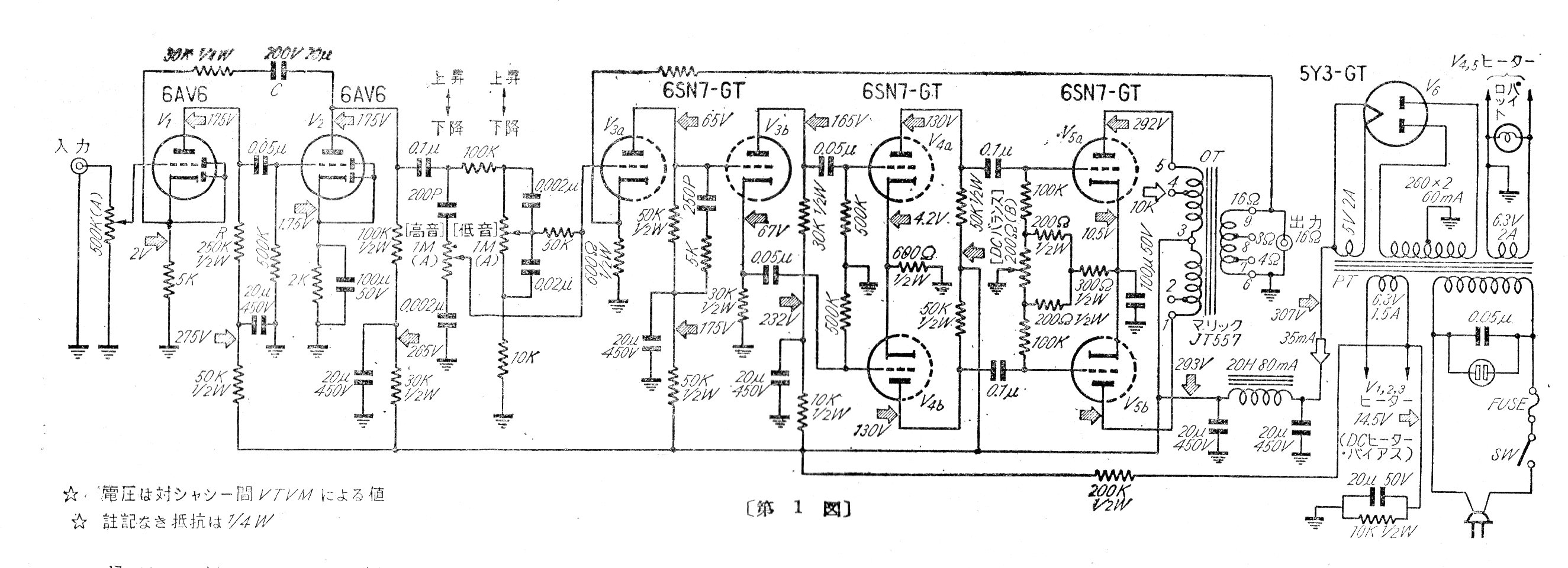 Este potente amplificador de alta fidelidad fue encontrado en una revista técnica japonesa de 1955, la versión traducida de la Radio Experimenter's Magazine de Estados Unidos. El circuito tiene una excelente configuración para la época con transformadores especiales que garantizan la calidad de sonido.
