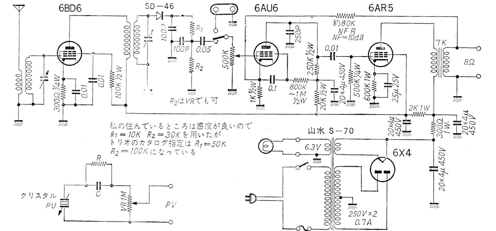 Este antiguo receptor para la banda de ondas medias, usando la válvula 6AR5 en la salida proporciona buena potencia de audio y sensibilidad en un diseño simple de los años 60. De hecho, el circuito es de amplificación directa suficiente para buena recepción de las estaciones locales. El circuito tiene entrada para tocadiscos.