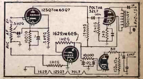 Encontramos este circuito en una documentación de 1945. El circuito es muy sensible y tiene dos entradas. La alimentación es directa con los filamentos de las válvulas conectados en serie.