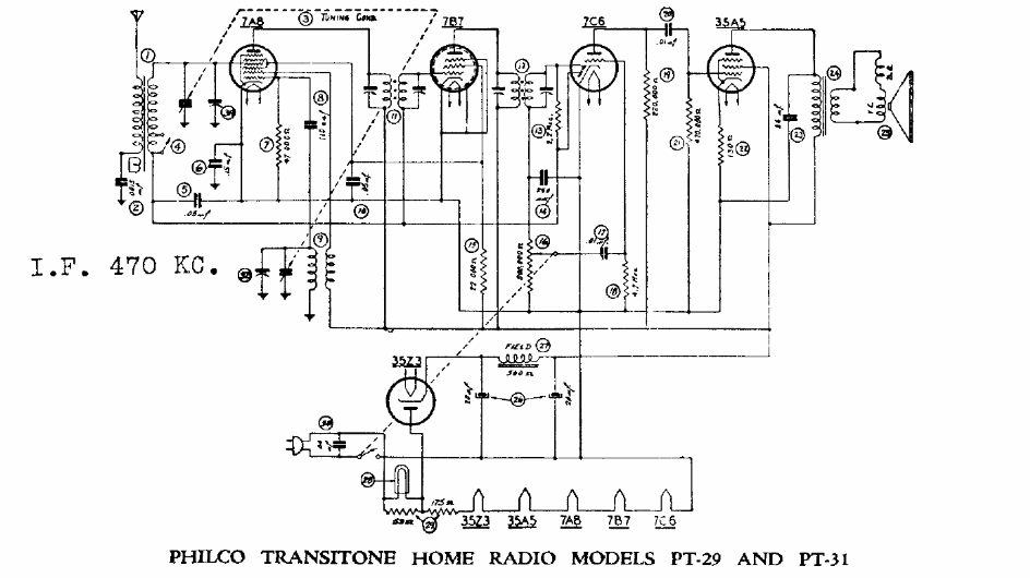 Este receptor doméstico de 5 válvulas de Philco usaba la alimentación sin transformador (AC / DC) con los filamentos de las válvulas conectadas en serie. El circuito tenía una FI de 470 kHz.