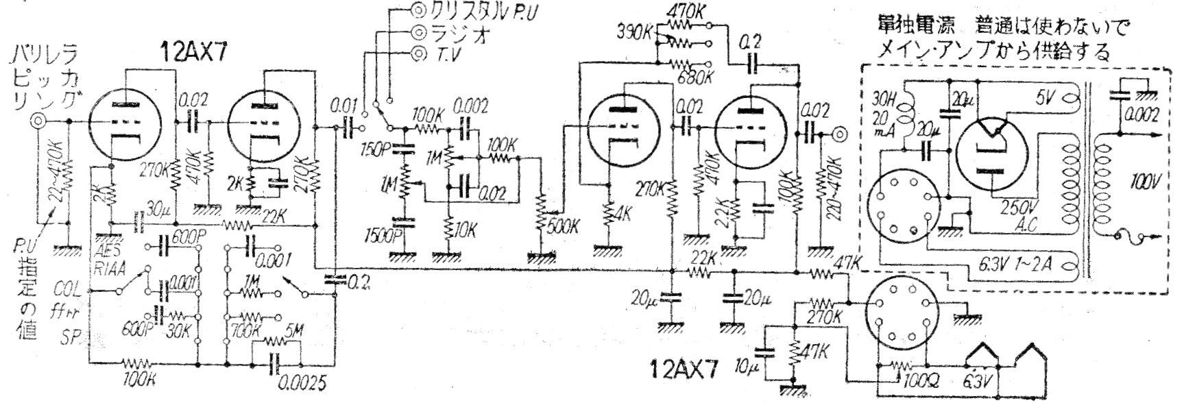 El artículo que describe el montaje de este preamplificador amplificador fue encontrado en la traducción japonesa de una documentación americana. El circuito del amplificador de 13 W que lo acompaña se da en el V702. El circuito incluye la fuente de alimentación.