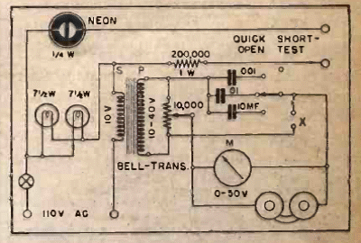 Este es un circuito probador de capacitores de 1944. El circuito es para capacitores de alta tensión usando un voltímetro como indicador. El circuito está alimentado por la red eléctrica.