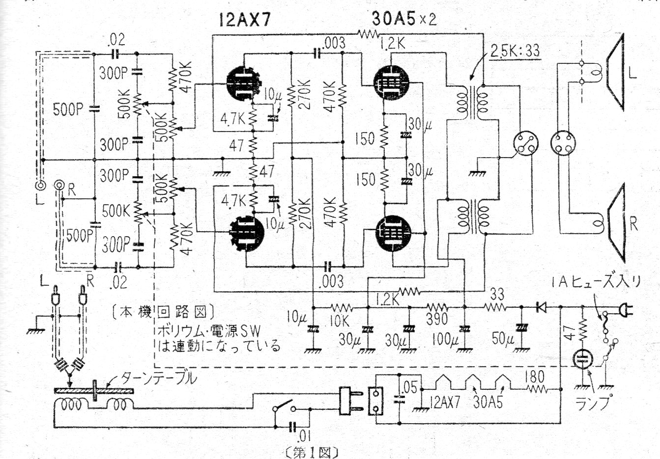 Este antiguo amplificador valvulado (1959) utiliza 2 válvulas dobles proporcionando una potencia de 2 o 3 W de salida. Los componentes usados no son comunes actualmente, sino que son como referencia para la búsqueda o recuperación de aparatos antiguos.