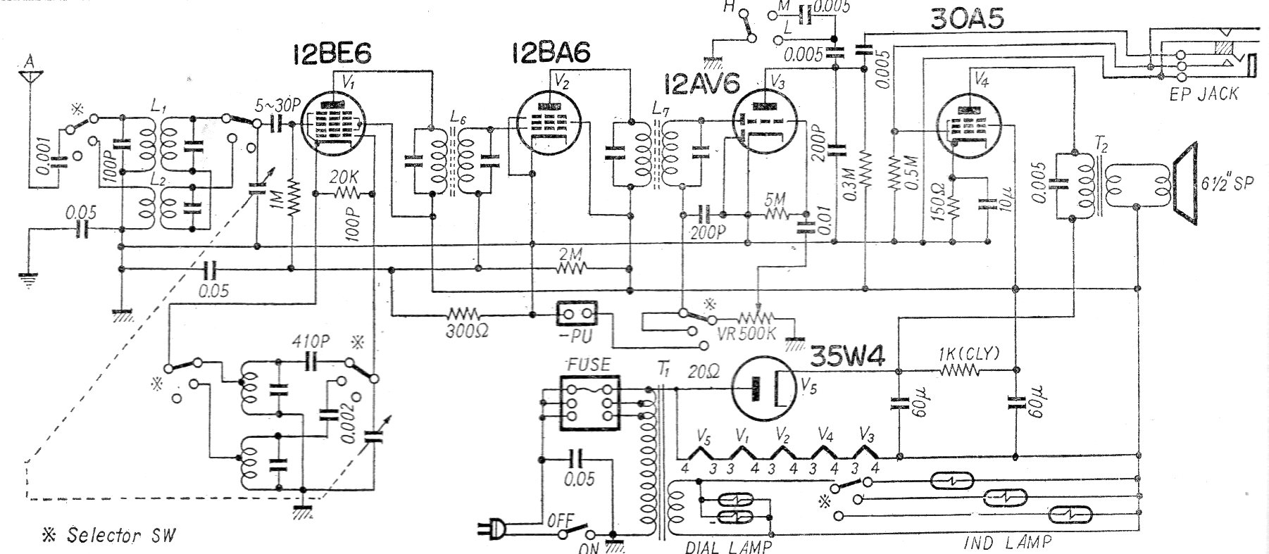 Este es un radio AM valvulado típico de los años 60. El circuito es comercial, siendo vendido en la época en Japón y en otros países, operando con FI de 455 kHz. El circuito es para la banda de ondas medias y de ondas cortas.