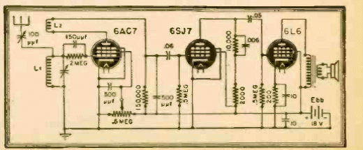 Este receptor de 3 válvulas funciona con batería con un suministro de tensión relativamente bajo. La escucha es a través de un parlante y el rango sintonizado en un circuito regenerativo es de ondas medias. El circuito es de una publicación de 1945.