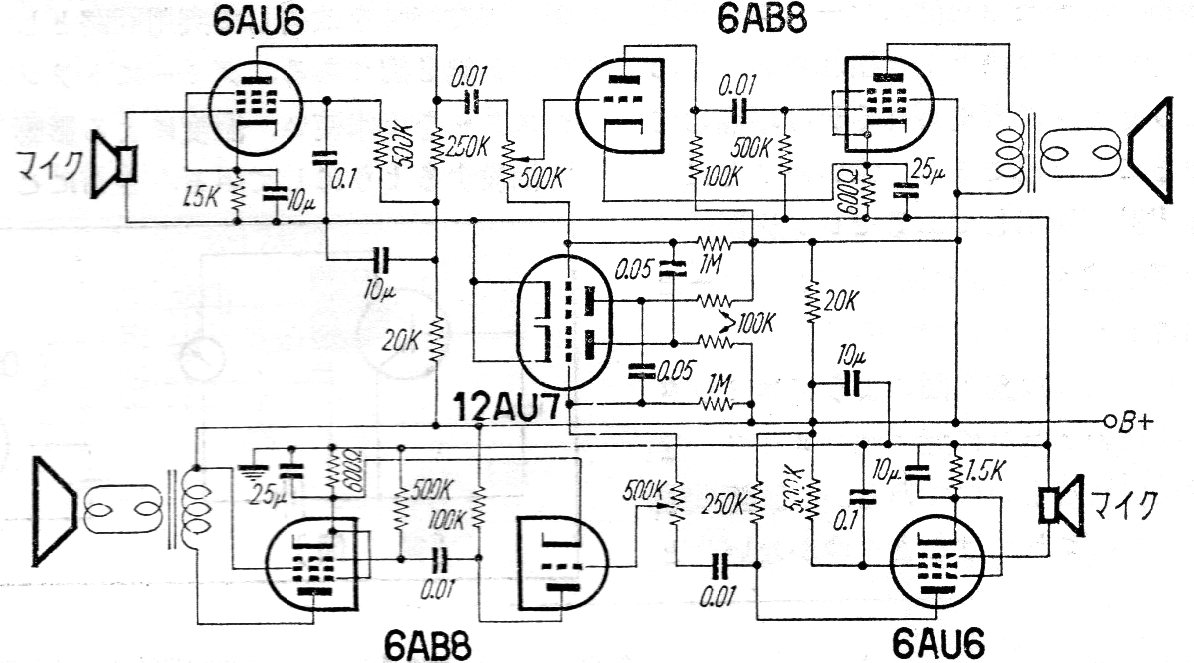 Este intercomunicador valvular se obtuvo en una publicación de los años 60. El circuito no utiliza la llave conmutadora y la fuente de alimentación no está incluida. Los micrófonos son tipos de baja impedancia.