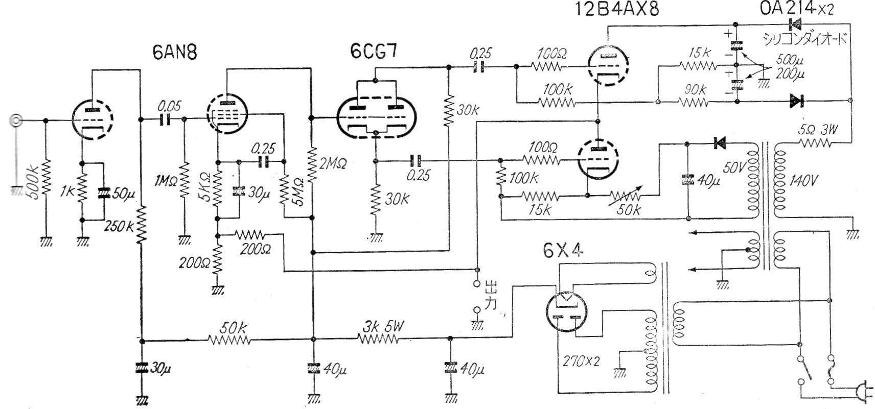 Este amplificador OTL con salida de baja impedancia fue obtenido en una publicación japonesa de los años 60. El circuito utiliza dos válvulas12B4A y se observa la existencia de un buen preamplificador. También se incluye la fuente de alimentación con la rectificadora bien conocida 6X4.