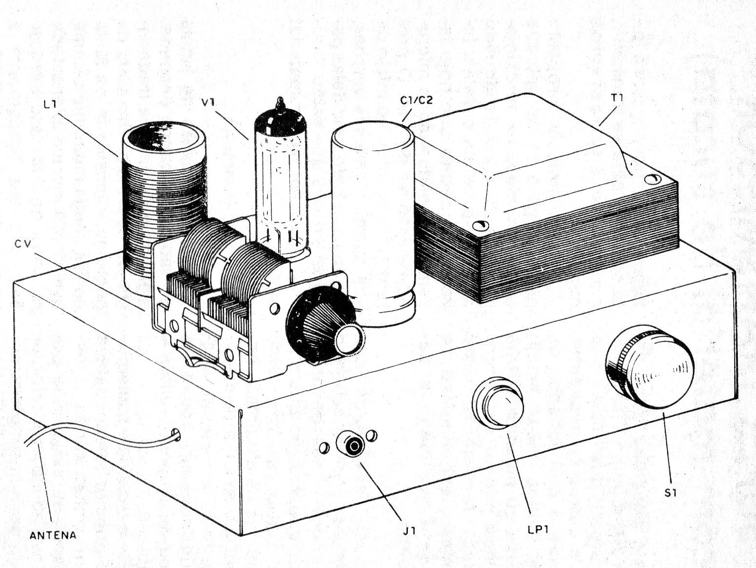 Para los lectores que no quieran aprovechar el chasis de la radio o del aparato del que se utilizan las piezas, sugerimos una caja de madera o incluso aluminio en la que se debe realizar la perforación del transformador, el soporte válvulas. C1/C2, la bobina y la fijación de la variable (en la parte superior), y en la parte delantera para el interruptor S1, la lámpara piloto y el Jack de micrófono J1.