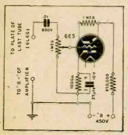 En la figura tenemos un antiguo circuito indicador de volumen con una válvula indicadora 6E5. El circuito es de una documentación de 1944 y debe ser alimentado con 450 V.