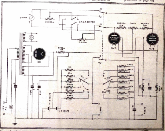 Este sensible voltímetro electrónico se encontró en una publicación de 1944. El circuito está alimentado por la red eléctrica y tiene varias escalas. Se puede utilizar para mejorar la sensibilidad de un multímetro común.