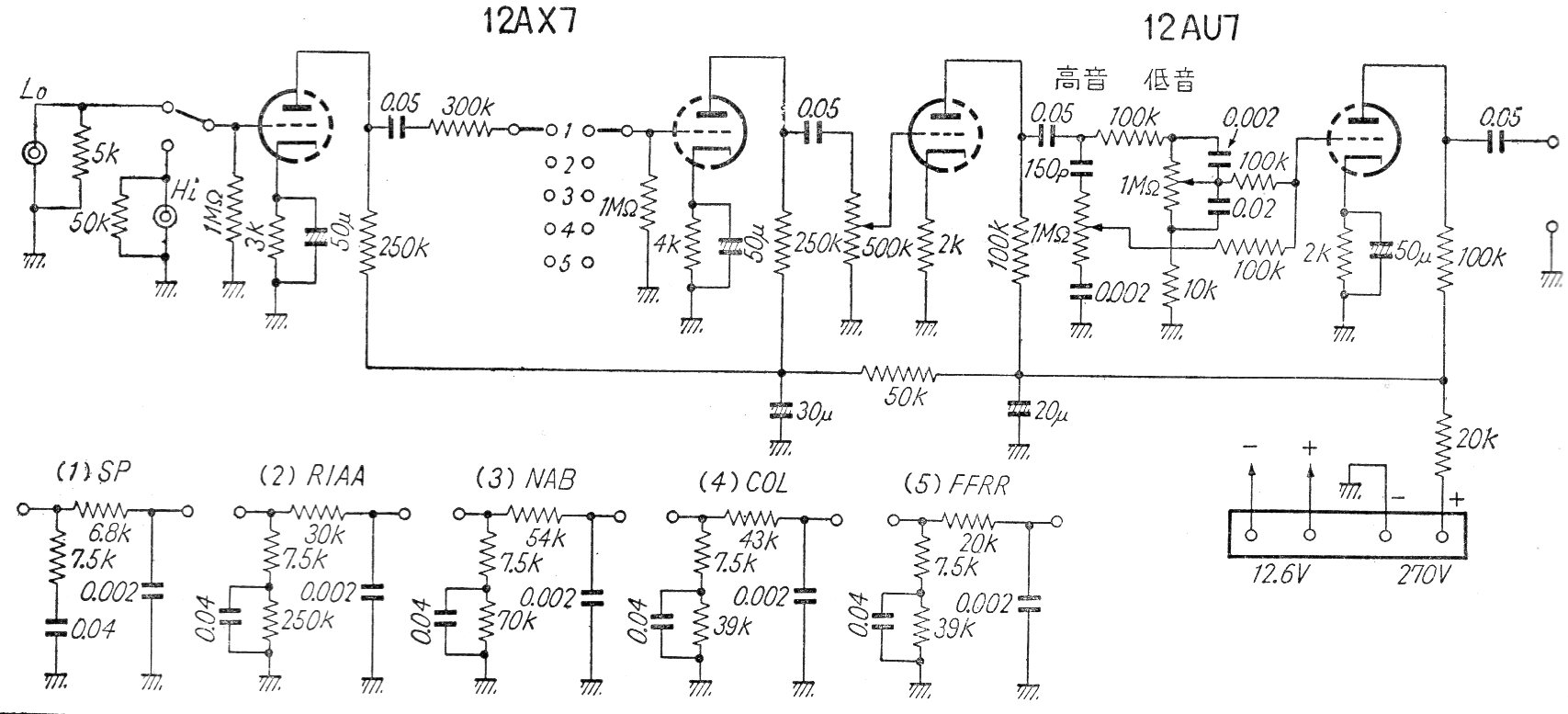 Este ecualizador con preamplificador posee diversas redes de ecualización según el tipo de aplicación deseada. El circuito fue encontrado en una documentación japonesa de los años 60 y, además, posee un control de tono. No se ha suministrado la fuente de alimentación.