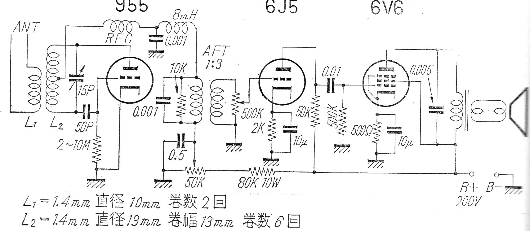 Este receptor para el rango de 50 MHz se encontró en una publicación japonesa de los años 50. El circuito no incluye la fuente de alimentación y los datos de las bobinas se suministran junto al diagrama.