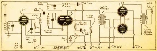 Este receptor de 3 válvulas se encontró en una publicación de 1942. Alimentado por batería, está diseñado para la recepción de onda media. La salida de audio es potente mediante el uso de das válvulas en contrafase.