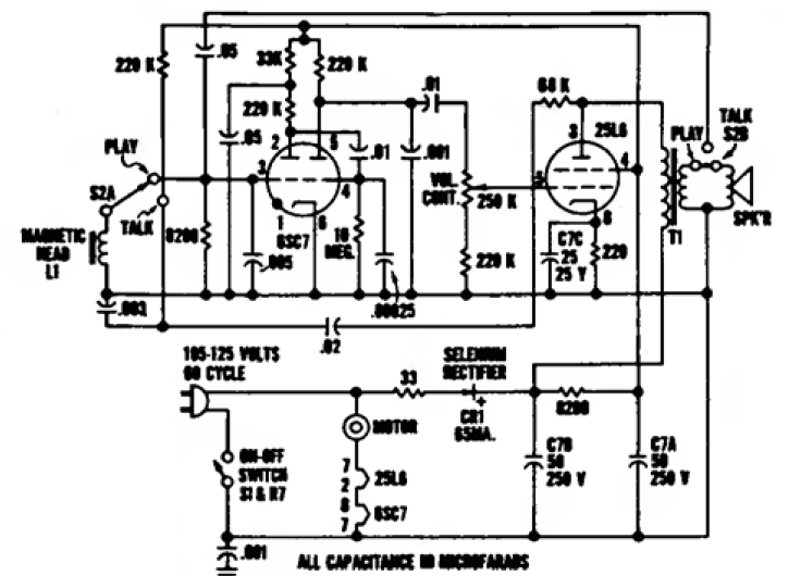 Este pequeño amplificador para tocadiscos con fonocaptor magnético era muy simple y proporcionaba potencia del orden de 1 W. Las dos válvulas tenían los filamentos conectados en serie.