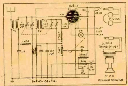 Este circuito receptor de doble válvula con escucha de auriculares o altavoz se encontró en una documentación de 1945. El circuito tiene doble sintonía y se alimenta con las tensiones indicadas en el propio esquema.