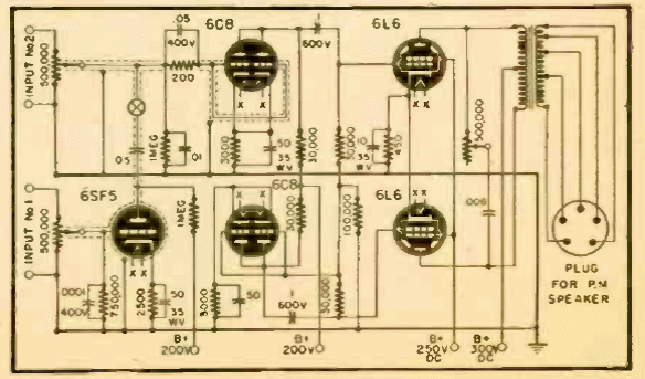 Este potente amplificador con válvulas 6L6 en push-pull fue lanzado en Radio Craft alrededor de 1945. El circuito tiene un transformador con diferentes impedancias de salida y no se indica la fuente de alimentación.