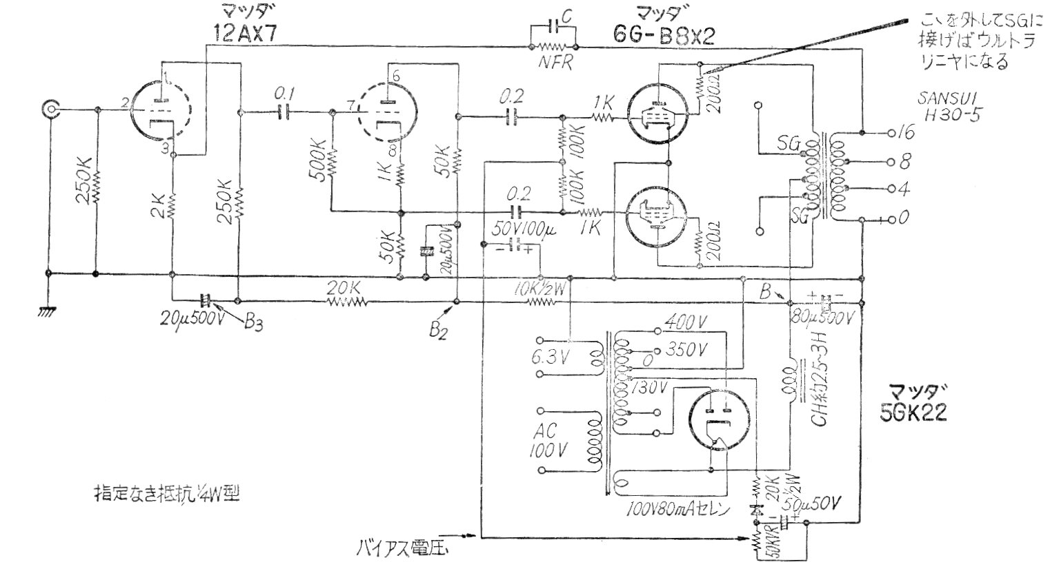 Este potente amplificador fue encontrado en una publicación japonesa de los años 60. El circuito utiliza válvulas pentodo 6GB8 en push-pull con transformador e inversión de fase por una sola válvula. Se indica la fuente de alimentación. El circuito no tiene control de tono y volumen que debe quedar en el preamplificador.