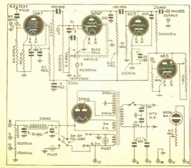 Este circuito es de una publicación de 1943 que usa 5 válvulas de período. El circuito consta de un amplificador y también de un sistema de prueba simple que utiliza una lámpara de neón. Un circuito muy útil en el banco de servicio en ese momento.