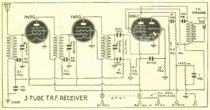 Este circuito de 3 válvulas para el rango de onda media se encontró en una publicación de 1943. El circuito no incluye una fuente de alimentación y está intervenido por un altavoz. Tenga en cuenta que este es un circuito de amplificación directa con 3 etapas de sintonización.